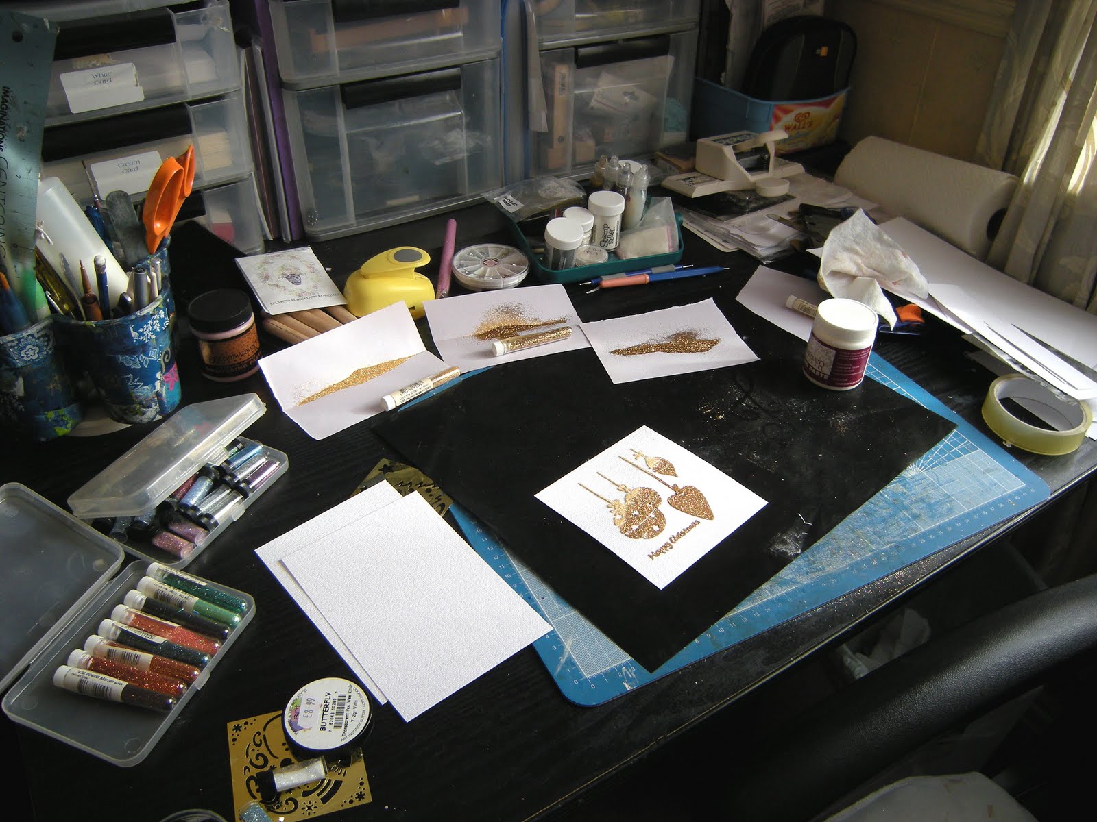 gorgeous Christmas cards luv all the glitter, have great day,happy WOYWW, sue,(17)x